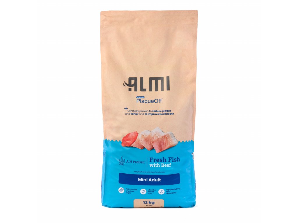 Granule ALMI jsou obohacené o PlaqueOff™, u kterého je klinicky prokázáno, že snižuje zubní plak, zubní kámen a zlepšuje špatný dech. Mají pečlivě vybrané složení, aby zajistily vyváženou a výživnou stravu pro Vašeho psa. Obsahují rybí maso, konkrétně sledě a hovězí maso plné bílkovin pro silné svaly. Dále rýži, která díky sacharidům dodává energii a podporuje aktivitu psa. Pro lepší stravitelnost jsou v krmivu jablka, hrách či řepná vláknina. Uvidíte, že Vašemu psovi zachutnají.