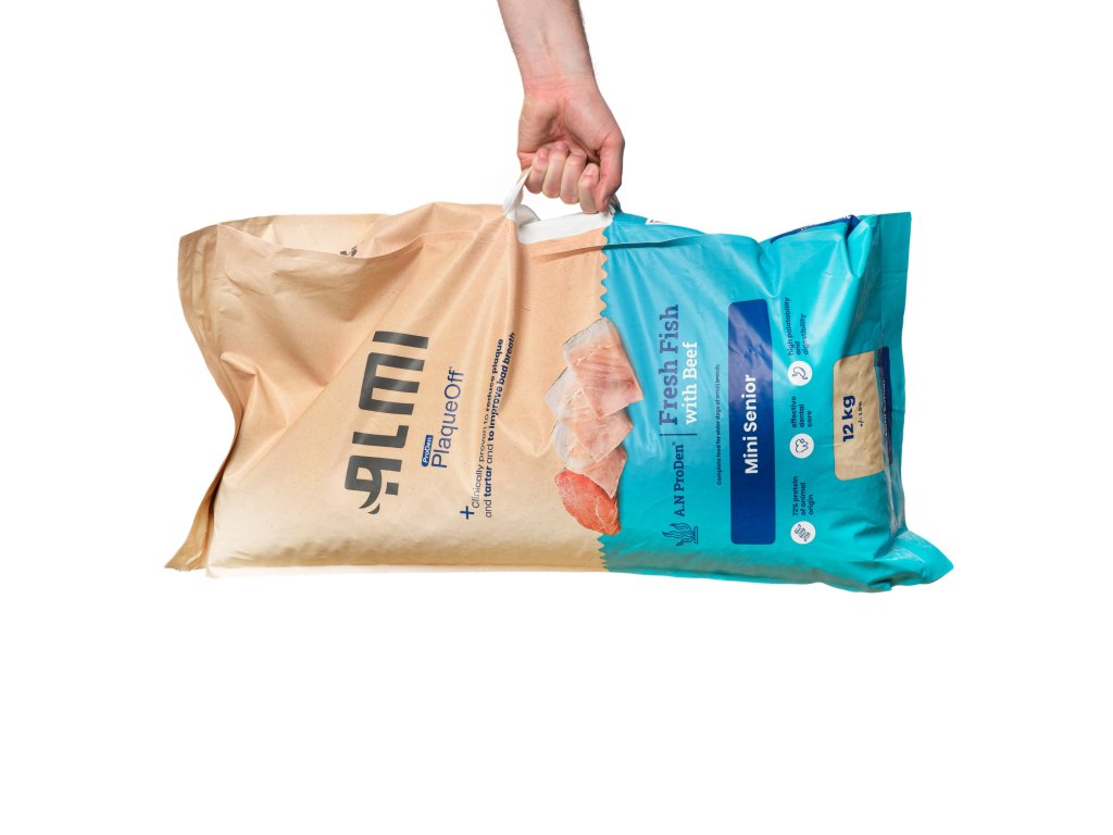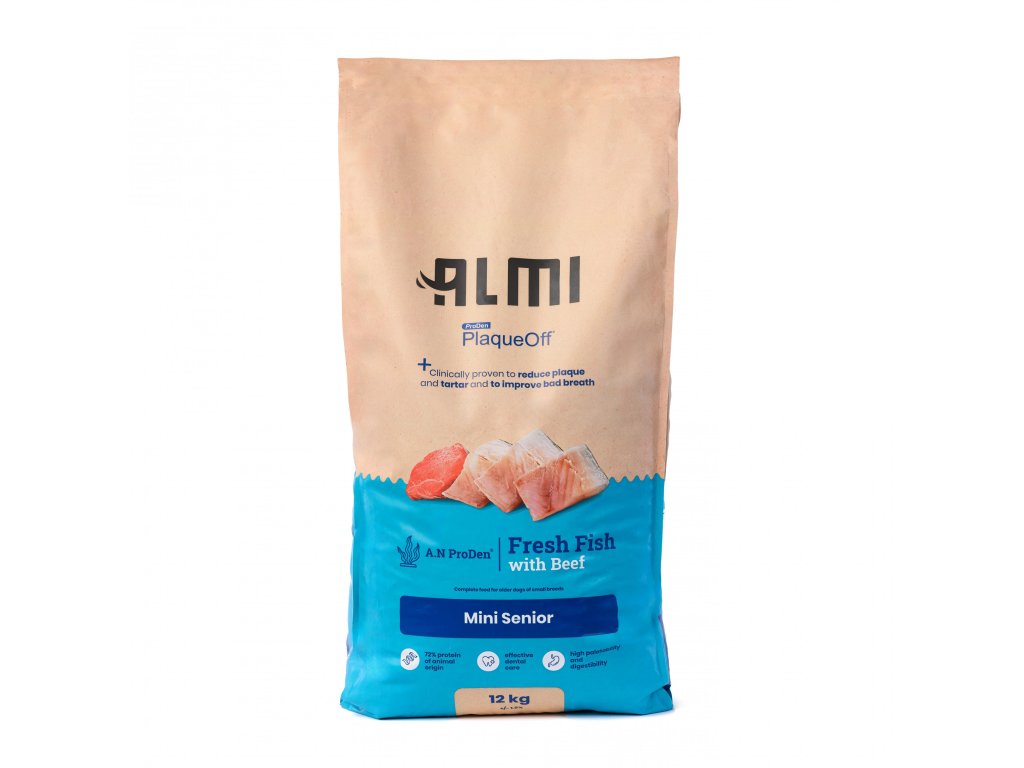 Složení granulí ALMI Mini Senior je pečlivě navrženo tak, aby vyhovovalo i starším psům a přispívalo k jejich zdraví. Krmivo obsahuje čerstvé rybí maso ze sledě, které díky omega-3 mastným kyselinám vyživuje klouby. Dále je v granulích čerstvé hovězí maso, hrách, jablka či rýže, která napomáhá stravitelnosti krmiva a dodává psům energii. Granule ALMI jsou obohacené o PlaqueOff™, u kterého je klinicky prokázáno, že snižuje zubní plak, zubní kámen a zlepšuje špatný dech.