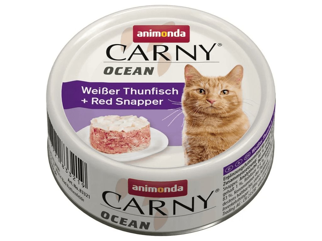 ANIMONDA Carny Ocean tuňák & red snapper spojuje kvalitní bílý tuňák, bohatý na esenciální aminokyseliny, s jemným masem kanice červeného, které dodává krmivu delikátní chuť.