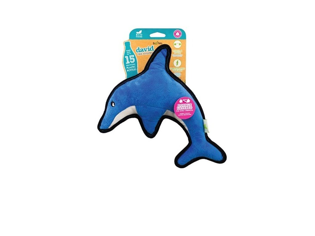 Hračka pro psy z řady Rough and Tough - delfín David je vyrobena z recyklovaných plastových lahví a má interaktivní, recyklovatelné pískátko. Hračka je dvouvrstvá a dvojitě prošita, díky čemuž je pevnější a odolnější. Jestli má Váš pes rád zápasení nebo mazlení, tato hračka ho určitě potěší.