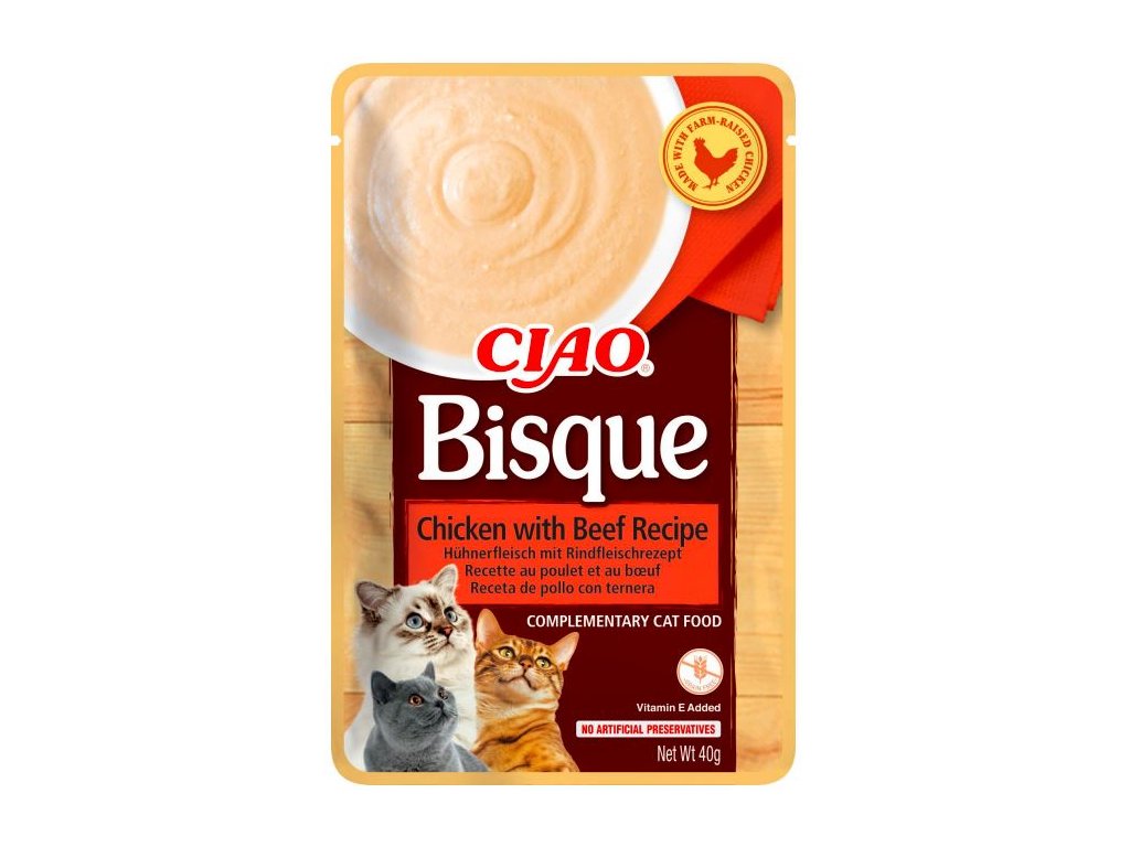 Ciao Bisque kuře a hovězí 40 g je jemný krémový pamlsek pro kočky, který kombinuje lahodné kuřecí a hovězí maso. Prémiová receptura bez obilovin, barviv a konzervantů přináší dokonalou chuť a zdravou hydrataci.
