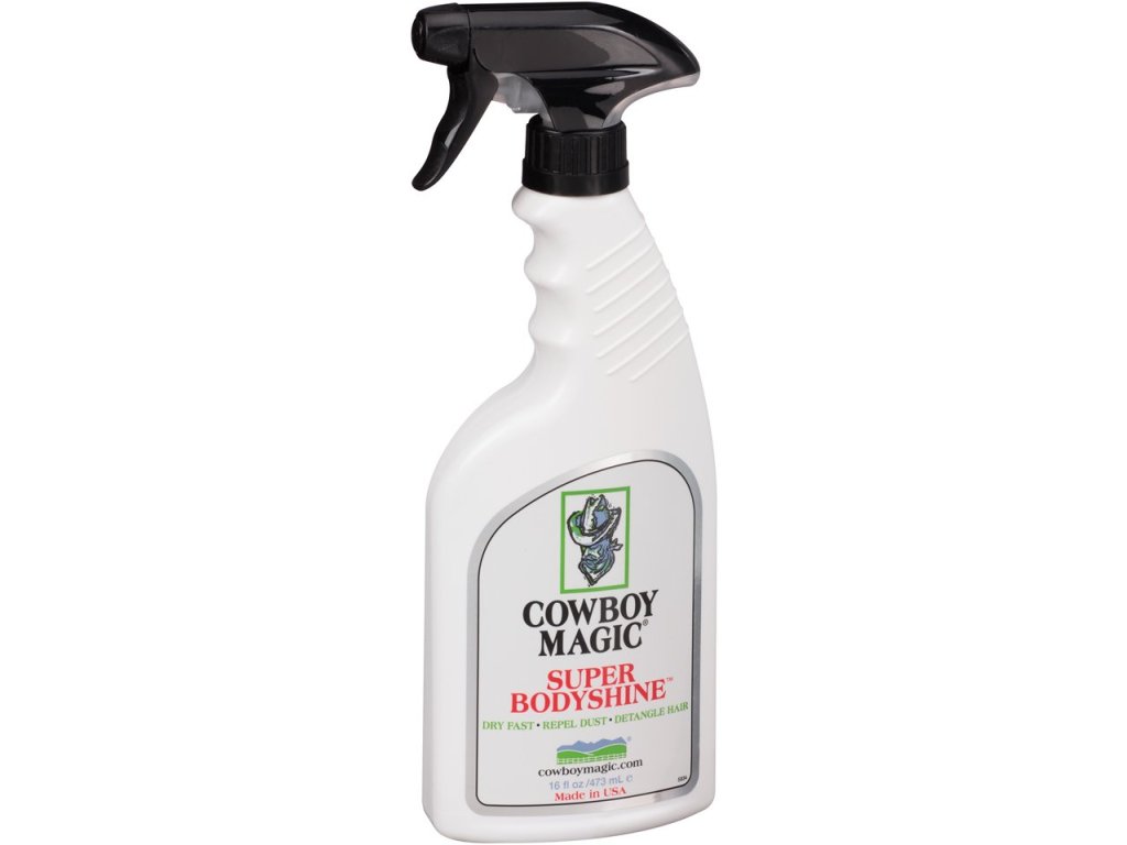 Cowboy Magic Super Bodyshine® ochraňuje srst před usazováním prachu, písku a nečistot ze stájí. Zanechává srst s hedvábným leskem a příjemnou vůní. Rychle působí a nedráždí. Stačí aplikovat pomocí rozprašovače.