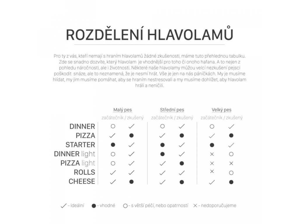 Hra DINNER light, stejně jako všechny ostatní hry, začíná tím, že Vy - páníček vložíte nějaký atraktivní pamlsek do všech otvorů pod hracími kameny. Třeba pár kousků granulí, tvrdého sýra, sušeného masa, prostě čehokoliv, na čem si Váš pejsek pochutná. Čím voňavější, tím lepší - logicky :)
