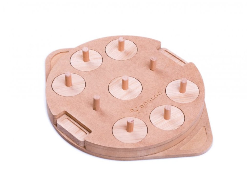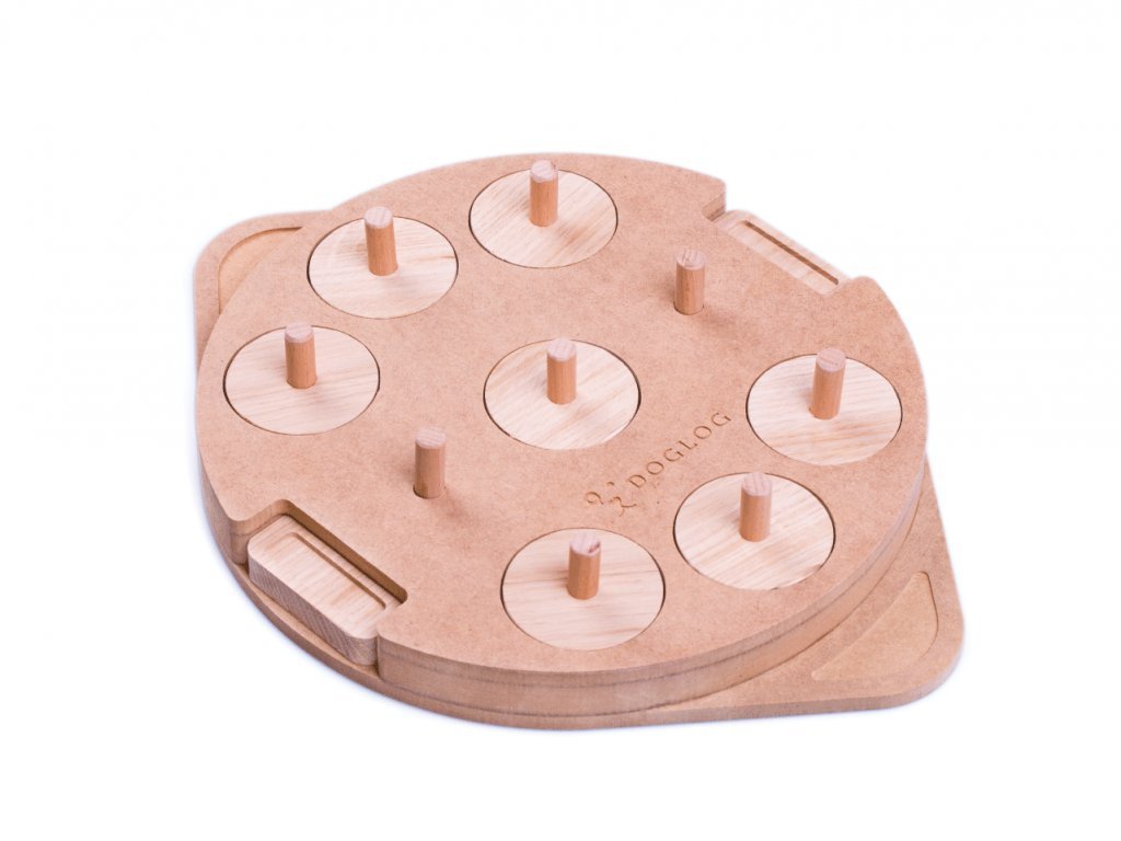 Základ je odstranit hrací kameny. Ty, narozdíl od ostatních hlavolamů, nemají úchyty z provázku, ale jsou také ze dřeva. Kdo by si myslel, že je díky tomu snáz odstraní tlapkou, ten je na omylu. Otvor pro hrací kámen je přesný jako oko tenisového rozhodčí, takže je nutné ho zvednout bezchybným pohybem směrem kolmo nahoru. Ovšem - chceme je také učit a ne jen zabavit, takže na konci přijde malá "zrada". Poslední dva kameny jsou zablokované. Musí si je odjistit vytažením "tyček" ze hry a teprve pak lze kámen vysunout ven, podobně jako šuplík. Tím se naučí dvoufázovým tahům a připraví se na další hlavolamy vyšších obtížností. V den, kdy zvládne všechny naše logické hry bez použití tlapek, mu kupte kost z Dinosaura a na obojek vyšijte titul "Mistr DogLog". :)