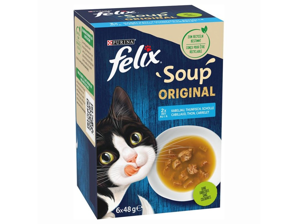 Polévka od firmy Felix je vyrobena z kvalitních surovin a rozmazluje dásně Vaší kočky svojí delikátní chutí. Díky velkému obsahu vlhkosti může přispět k tomu, aby Vaše kočka v průběhu dne přijala dostatek vody. Neobsahuje umělá aromata, barviva a konzervanty. Polévky Felix k Vám přichází v praktických sáčcích s přesným dávkováním pro jednu porci. Dostupné jsou různé smíšené varianty.