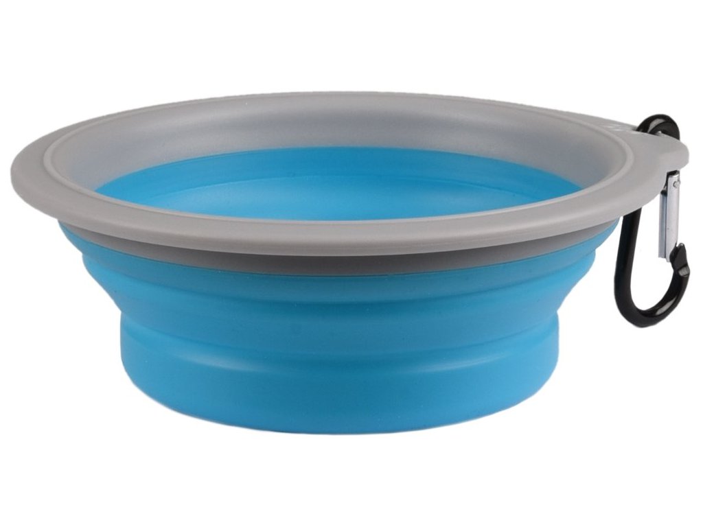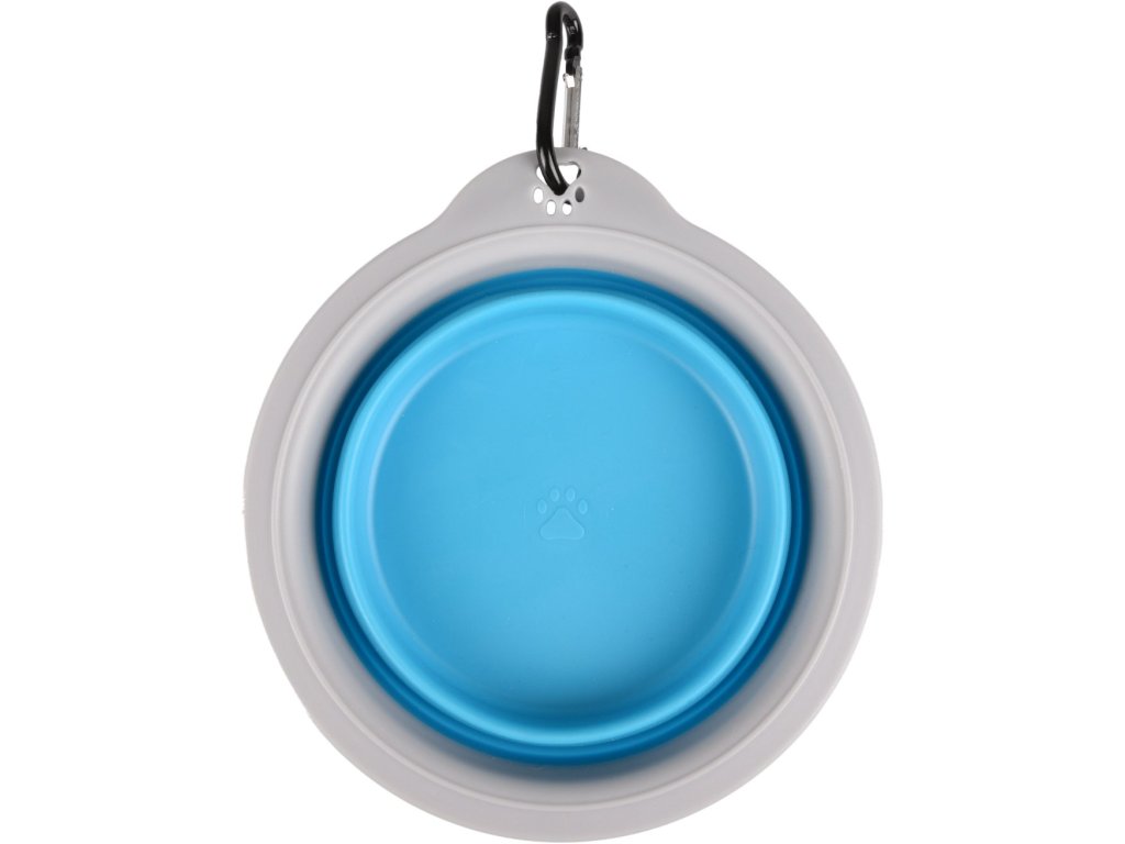 Praktická skládací miska pro psy určená na cestování s karabinou.