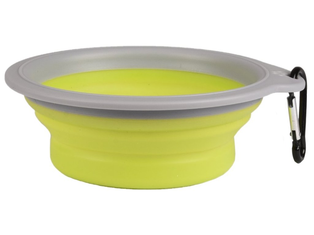 Praktická skládací miska pro psy určená na cestování s karabinou.