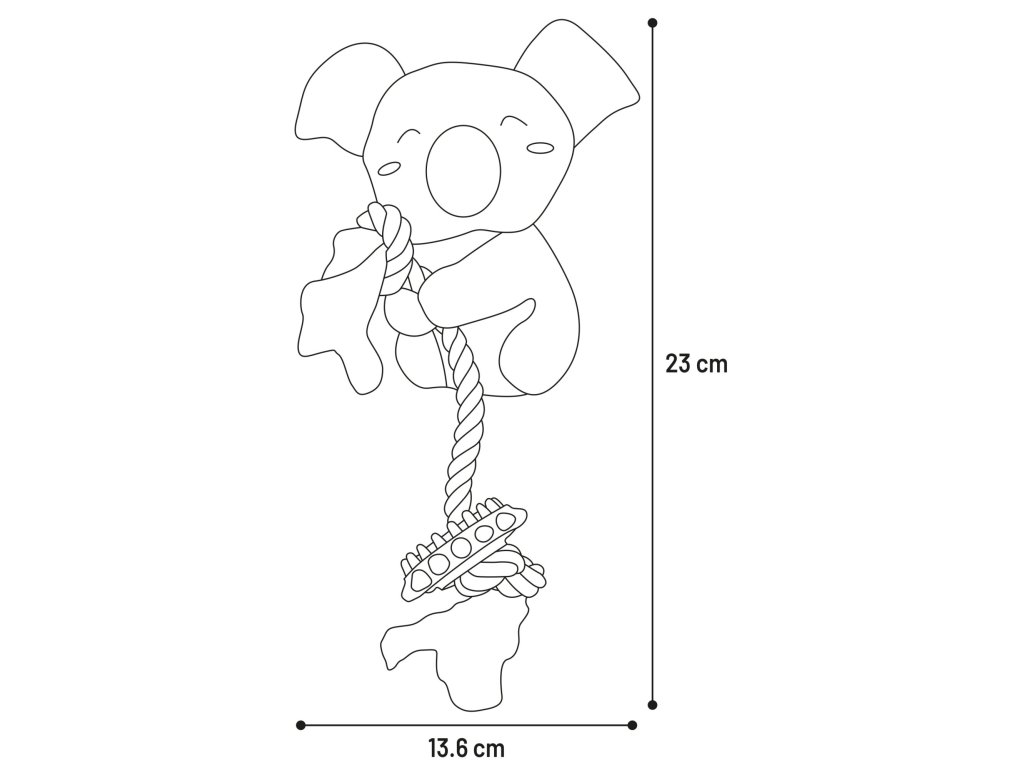 Seznamte se s touto roztomilou koalou! Je speciálně navržena pro štěňata, vyrobena z měkkého plyše, vybavena provazem a gumovým kousacím kroužkem na podporu dentální hygieny. Nejen, že pomáhá předcházet usazování zubního kamene, ale také masíruje dásně Vašeho malého čtyřnohého kamaráda. Zábava může začít!