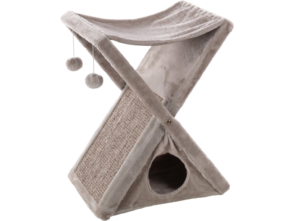 Greta od Flaminga je dokonalým kusem nábytku pro Vašeho kočičího kamaráda! Vyrobeno z odolného sisalu, MDF a měkkého plyše. Útulná plošina na lenošení je doplněna o škrabací podložku a úkryt s polštářem. Plyšový povrch (plyš s gramáží 250 g/m²) ručí za maximální pohodlí. Skládací a vybavený hračkami pro skvělou zábavu!