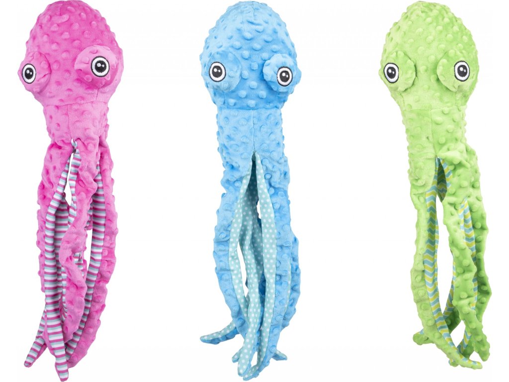 Tato plyšová chobotnice poskytne Vašemu zvířecímu příteli plno zábavy. Navíc, při každém kousnutí vydá hračka pískavý zvuk, což Vašeho psa znovu zaujme a pobaví. Různé barvy - modrá, růžová, zelená. Velikost 60cm.
