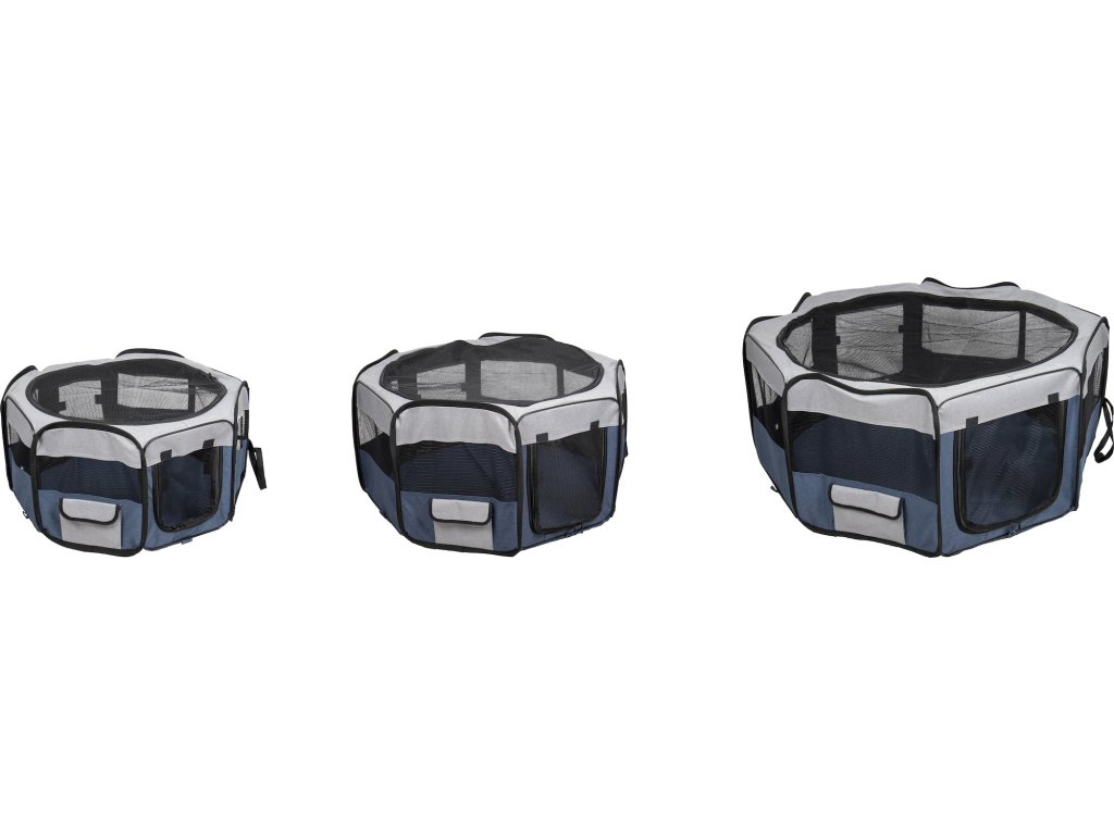 Cestovní ohrádka pro psy je praktická a lehká. Jednoduše se složí do velikosti tašky, a proto si ji můžete vzít všude s sebou. V přední a zadní části je vstupní otvor na zip. Vrchní síťka je odnímatelná. Praktická kapsa na boční straně Vám umožní uschovat potřebné věci.