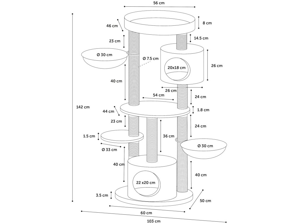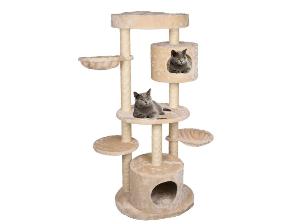 Toto škrabadlo Vaši kočku rozhodně zaujme. Je potažené měkkým plyšem, škrabací sloupky sisalovým lanem. Nabízí škrabací části, útulné kukaně pro schovávání, i volné plochy pro dokonalý relax, který všechny kočky milují. Škrabadlo je vhodné pro větší plemena nebo více koček. Robustní základní deska 60 x 50 cm zajišťuje stabilitu a jemné barevné provedení se hodí téměř do každého interiéru.