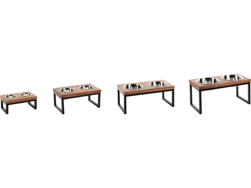 Stabilní kovová konstrukce s černou povrchovou úpravou a ochranou proti poškrábání podlahy. Deska z mangového dřeva se 2 vyjímatelnými miskami. Nerezové misky lze mýt v myčce. Pro psy všech velikostí a plemen. Určen pro vnitřní použití. Dopřejte svému věrnému čtyřnohému příteli stylový kulinářský zážitek!