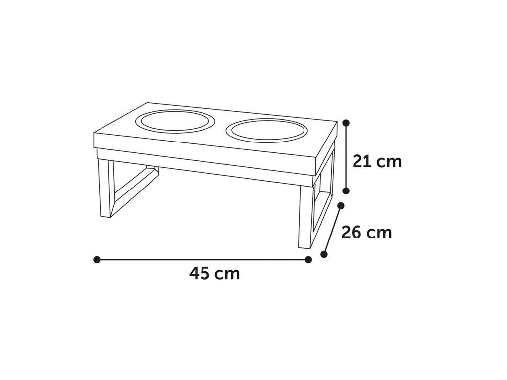 Stabilní kovová konstrukce s černou povrchovou úpravou a ochranou proti poškrábání podlahy. Deska z mangového dřeva se 2 vyjímatelnými miskami. Nerezové misky lze mýt v myčce. Pro kočky a psy všech velikostí a plemen. Určen pro vnitřní použití. Dopřejte svému věrnému čtyřnohému příteli stylový kulinářský zážitek!