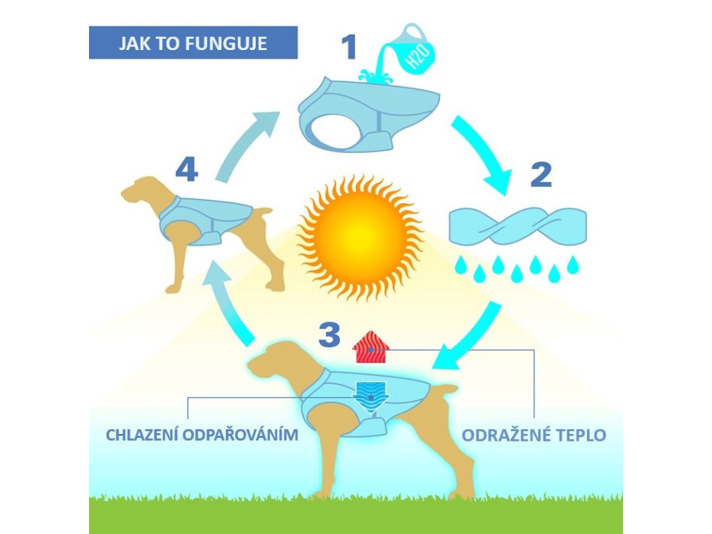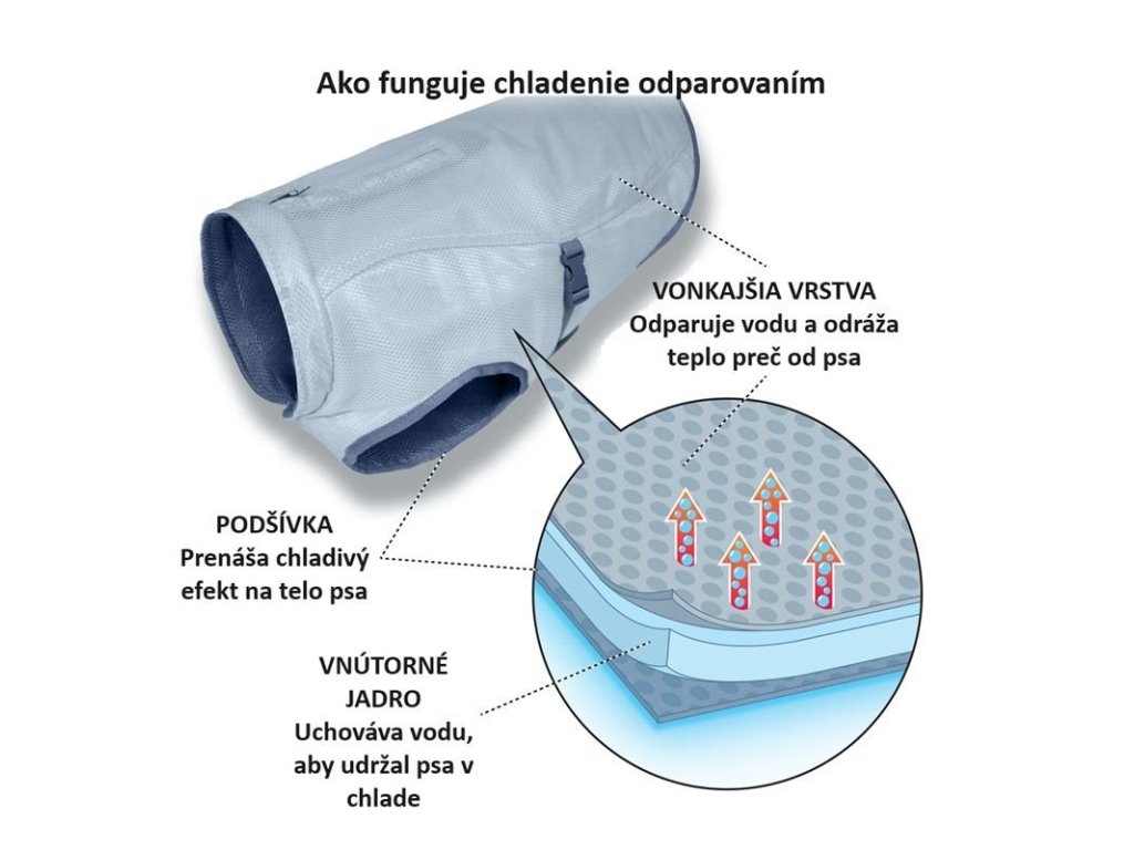 - Soustřeďuje chladící účinek na tělo psa