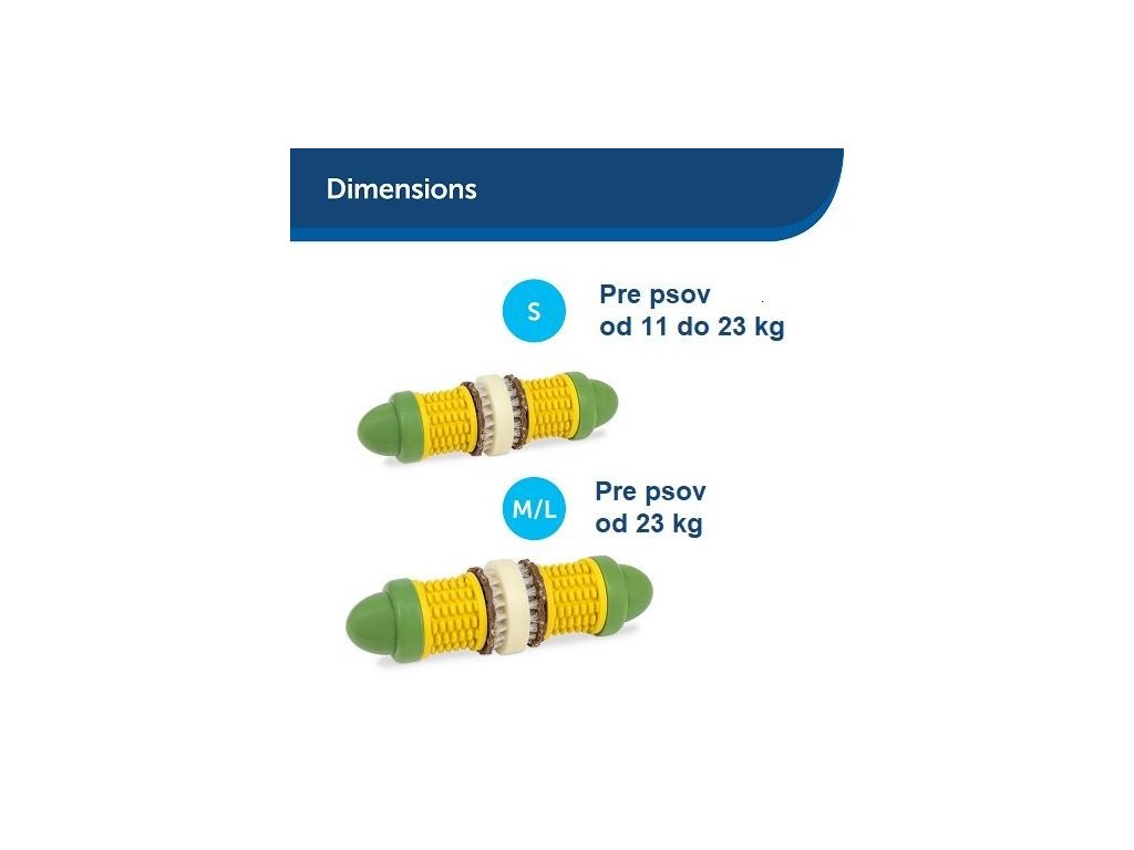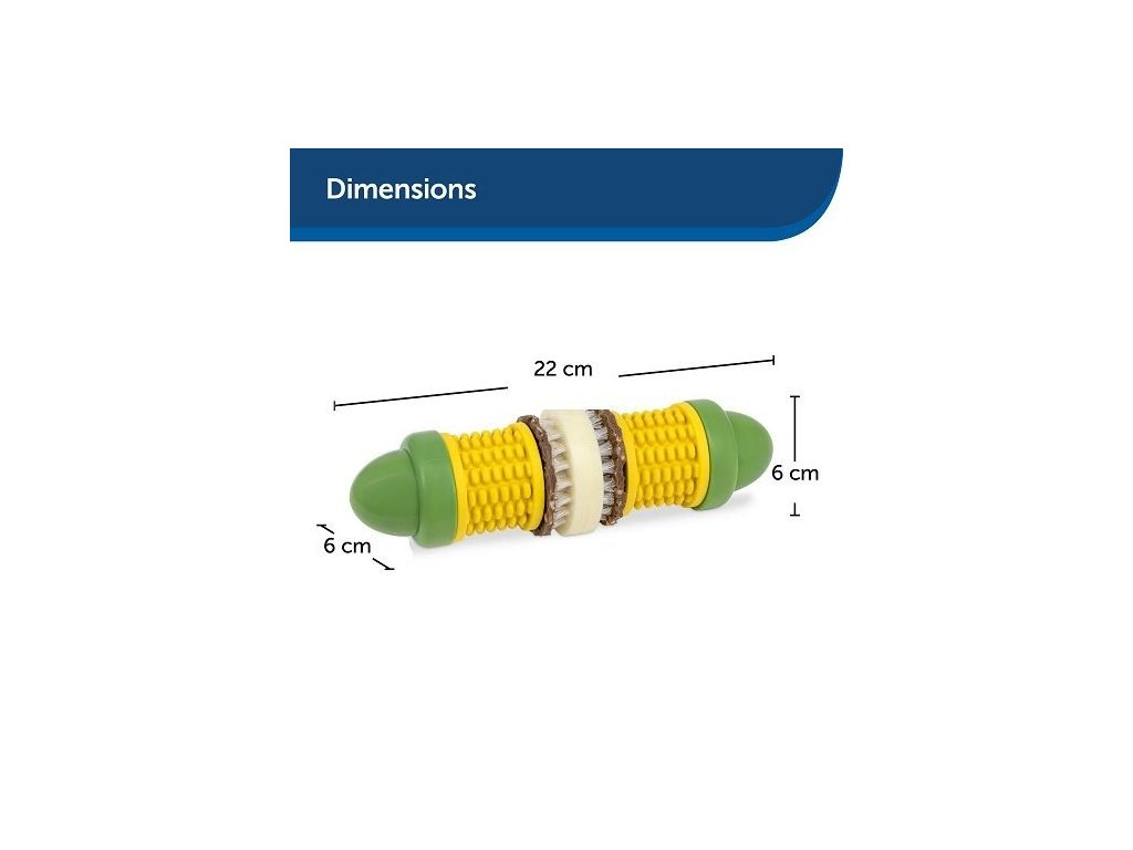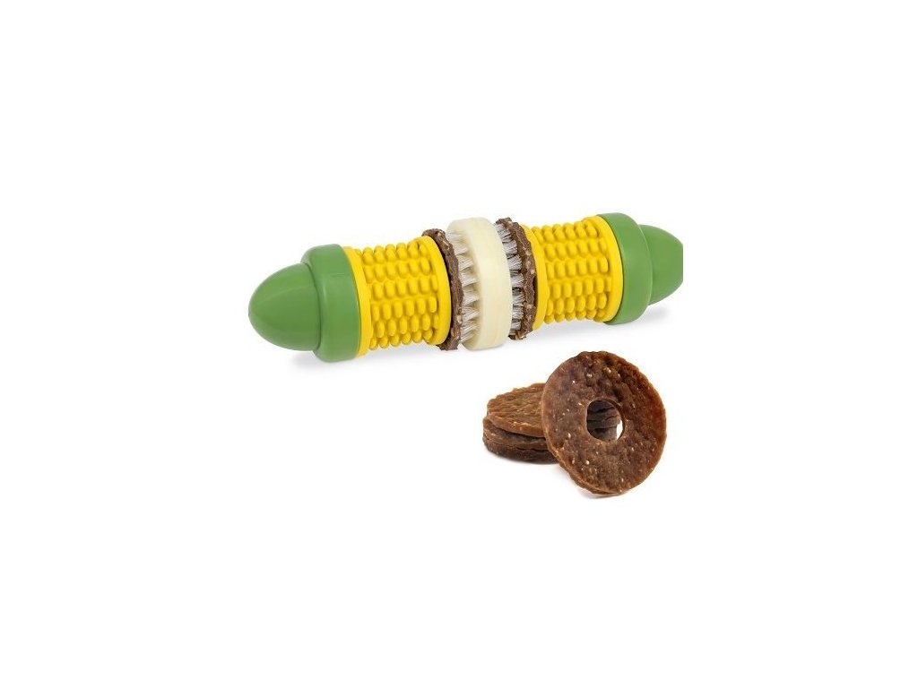 Podělte se se svým čtyřnohým přítelem o zábavu během letní grilovačky nebo při přípravě večeře! Tato hračka je dokonalou pochoutkou. Stačí přidat 2 náplně pro ještě lepší chuť. Pro delší zábavu můžete kukuřičná zrna natřít ořechovým máslem (nebo čímkoli, co má Váš pes rád). Texturovaný povrch hračky pomáhá odstraňovat nečistoty, zabraňovat jejich usazování, a tak pomáhá udržovat zuby a dásně zdravé. Je to takový chytrý zubní kartáček, který vypadá a chutná jako snack – geniální, my víme! Guma použitá při výrobě neobsahuje BPA a má máslovou vůni. To vše proto, aby byl Váš pes šťastný i po konzumaci náplní, které jste mu tam dali. A abychom Vám usnadnili život, hračka se jednoduše čistí a je vhodná i do myčky na nádobí.