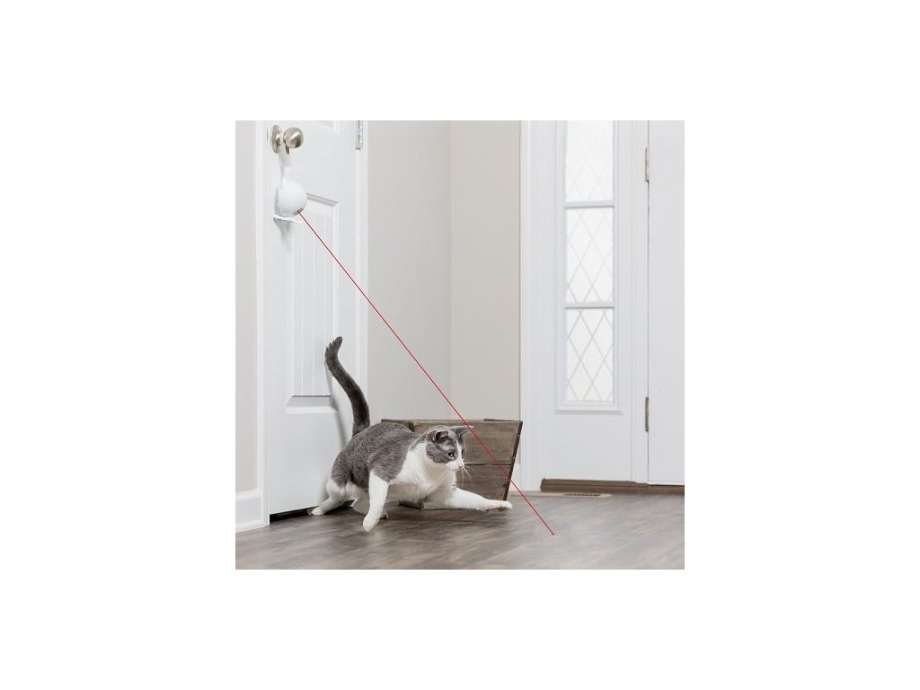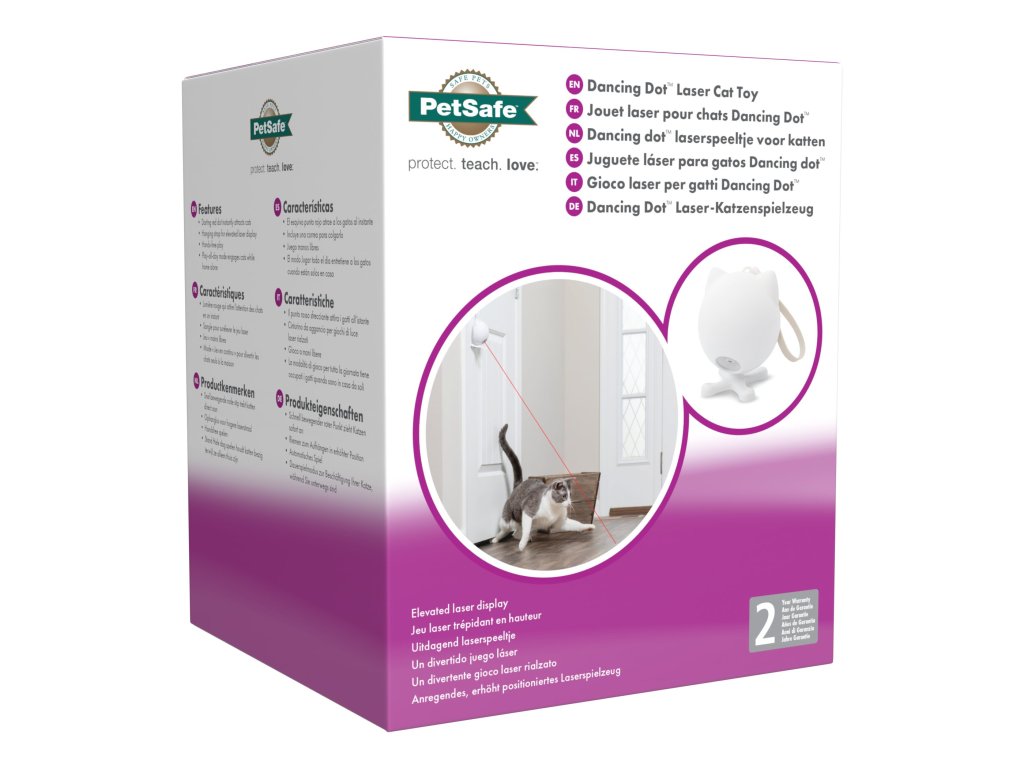 PetSafe® Dancing Dot™ je poutavá hračka pro kočky. Náhodné vzory a pohyby laseru udržují zájem Vaší kočky tím, že stimulují její přirozené instinkty k pronásledování a lovení. Nechte své kotě skákat a hrát si celý den (i když nejste doma). S touto laserovou hračkou má o zábavu postaráno. Jednoduše umístěte hračku na jakýkoli vyvýšený rovný povrch nebo ji zavěste na kliku dveří. Díky dvěma možnostem režimu přehrávání a náhodnému pohyblivému laserovému paprsku je hračka zábavným způsobem, jak udržet Vaši kočku zdravou a aktivní.