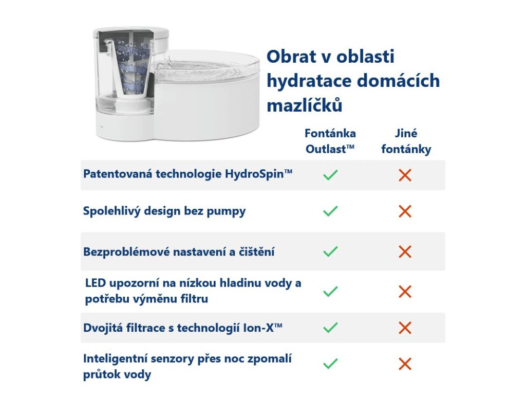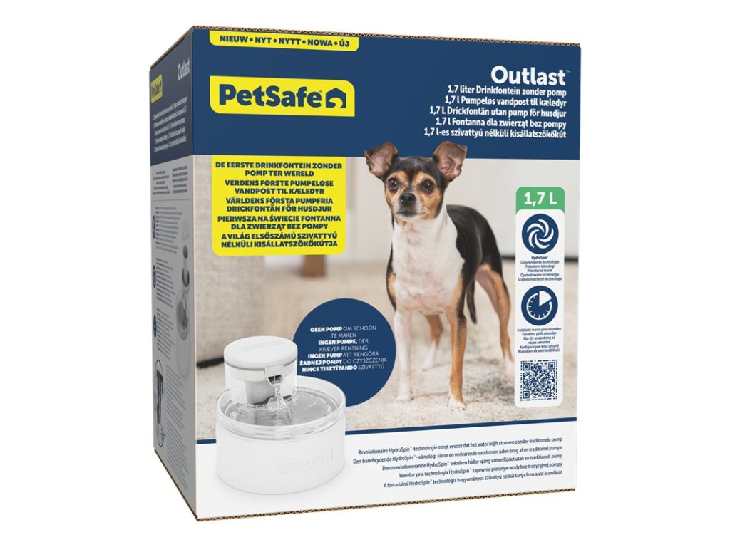 Seznamte se s PetSafe® Outlast™ 1,7 litrovou bezpumpovou fontánkou pro domácí mazlíčky – první fontánou pro kočky a psy na světě bez tradiční pumpy! PetSafe® patentovaná technologie HydroSpin™ udržuje vodu proudící a odstraňuje problémy, které přicházejí s tradičními fontánami. Filtrační systém udržuje chuť a svěží vzhled vody, díky čemuž má Váš mazlíček zdravější zážitek z hydratace.