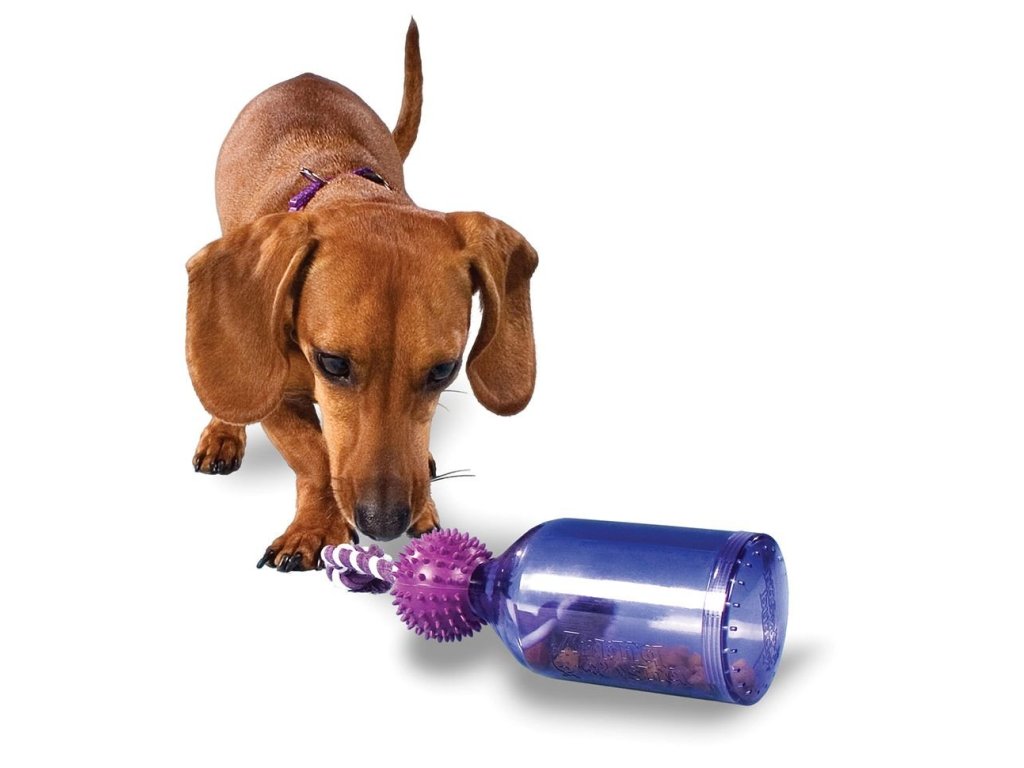 Tato důmyslná hračka zajistí psovi dlouhou zábavu. Využít ji můžete i při tréninku nebo na krmení. Skládá se z lahve, která je vyrobena z odolného materiálu, lana a gumového míčku. Při pohybu z lahve vypadávají pamlsky.