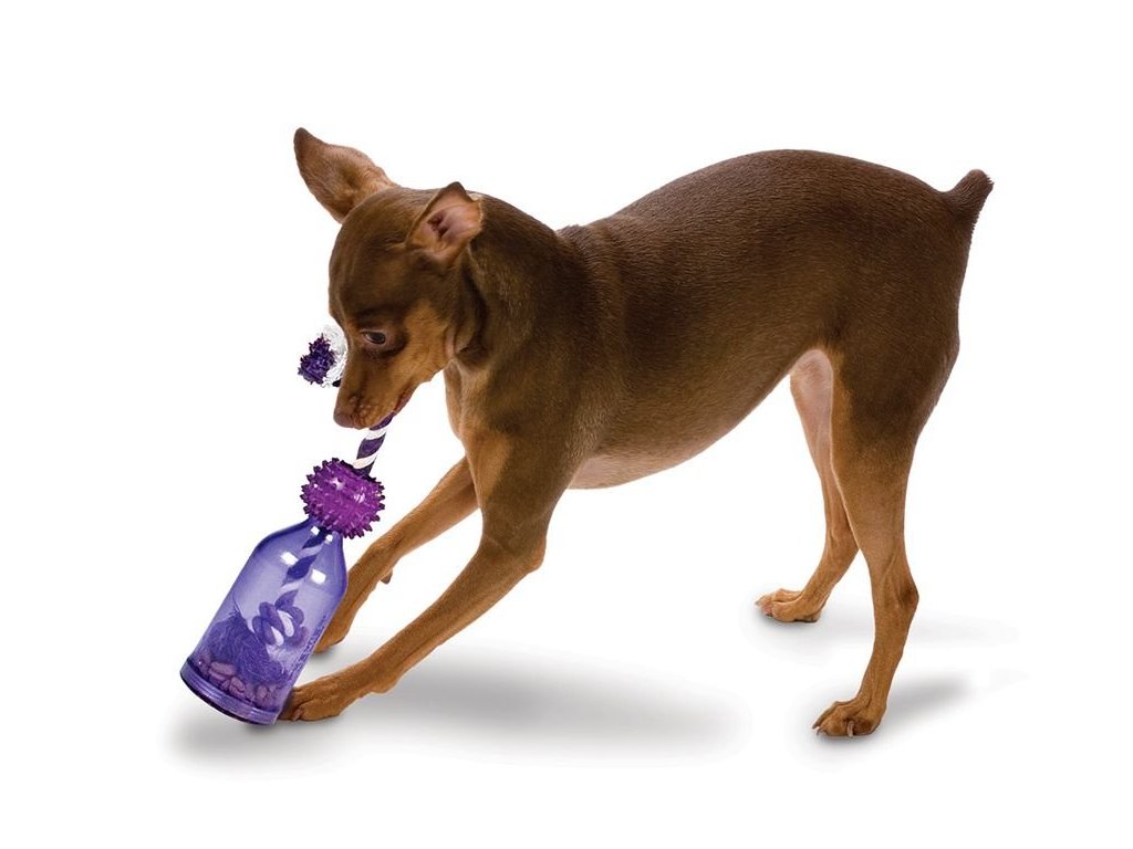 Tato důmyslná hračka zajistí psovi dlouhou zábavu. Využít ji můžete i při tréninku nebo na krmení. Skládá se z lahve, která je vyrobena z odolného materiálu, lana a gumového míčku. Při pohybu z lahve vypadávají pamlsky.