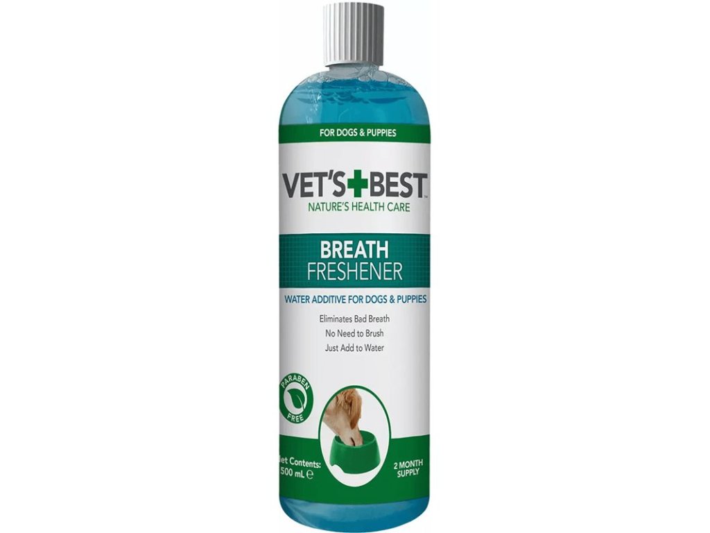 Vet's Best dentální dechový osvěžovač pro psy je přírodní přísada do vody, která osvěžuje dech Vašeho psa. Obsahuje přírodní antibakteriální složky i mátový olej a hřebíčkový olej. Stačí přidat čajovou lžičku do vody pro Vašeho domácího mazlíčka, abyste potlačili zdroje nepříjemného dechu. Pro komplexní řešení ústní péče doporučujeme, aby byl tento výrobek použit ve spojení s dentálním gelem pro psy Vet's Best