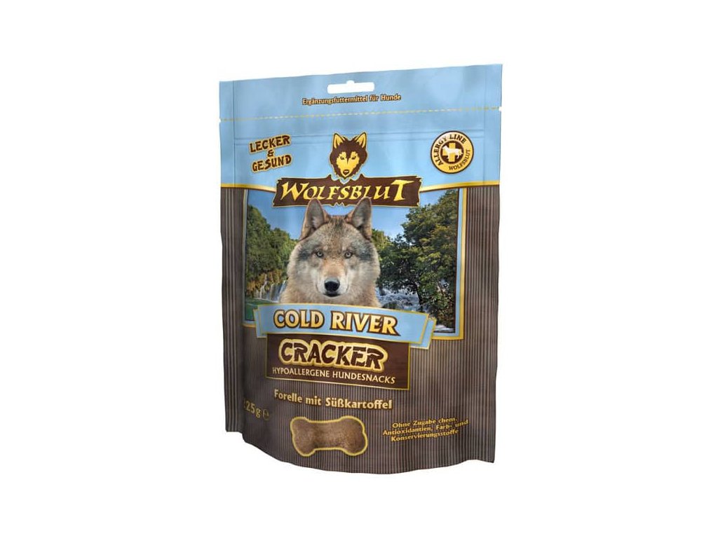 Wolfsblut Dog Cracker Cold River jsou bezobilné psí sušenky s vysokým podílem pstruha a lososa – ideální pro citlivé psy a alergiky.
